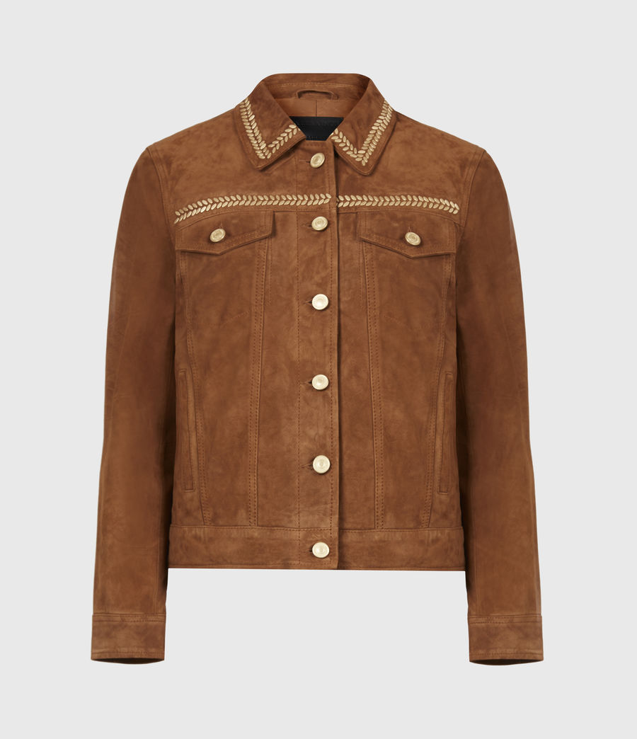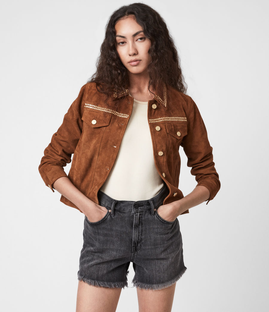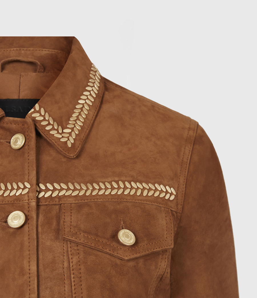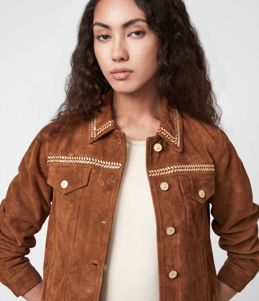 The Delvy brown suede trucker jacket for women is crafted from our premium suede with gold metal hardware. Pair with a simple outfit – it’s the main focus.